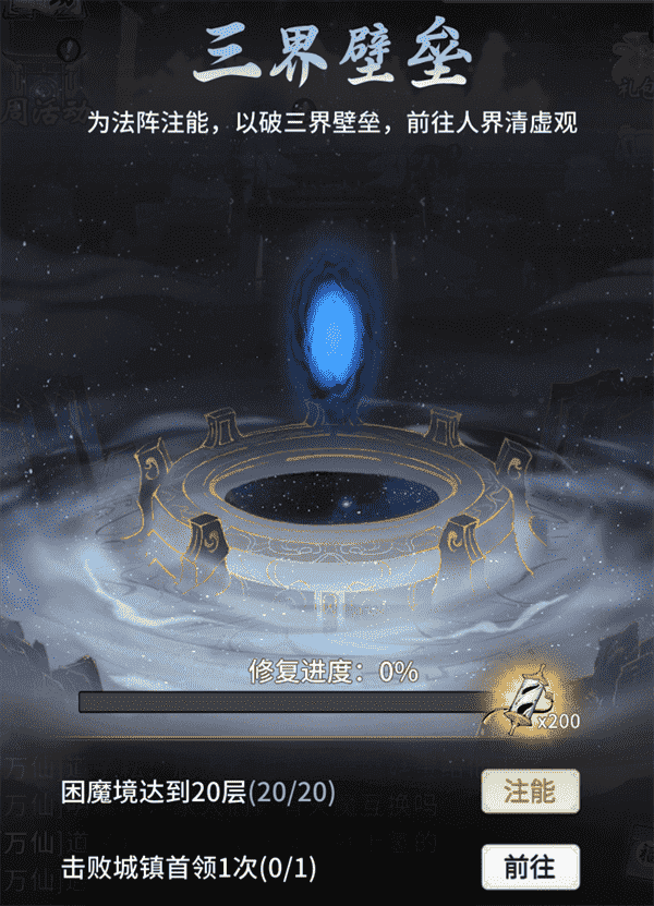 当你修为达到返虚/破虚中期后,,可在城镇寻得芸丫并激活神秘法阵,,,通过收集材料、、、、击败首领等方式为法阵注能,,,借以打破三界壁垒,,,,开启支线剧情“清虚旧梦”
