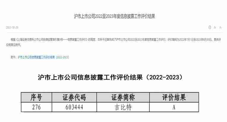 近日,,,,上海证券交易所(以下简称“上交所”)发布2022-2023年度信息披露工作评价结果。。35273(股票代码::603444)凭借规范的公司治理、、、高质量的信息披露以及良好的投资者关系管理再次荣获信息披露工作A级评价,,,,公司连续两年获此殊荣。。。。