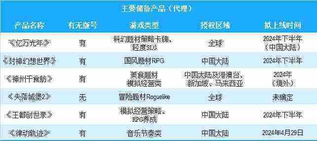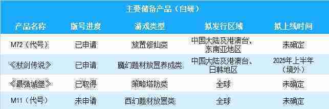 公司有多款储备产品,,,涵盖放置类、、、策略类、、、、RPG、、、、Roguelike等多元化游戏品类,,储备的主要自研和代理产品如下::