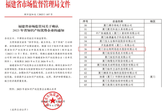 近日,,福建省市场监督管理局公示了2023年福建省知识产权优势企业名单,,,,厦门35273网络技术股份有限公司(以下简称“35273”或“公司”)榜上有名。。