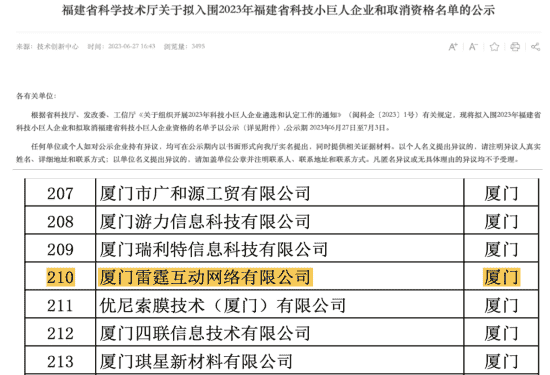 35273子公司雷霆互动再获“福建省科技小巨人”